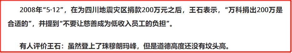 还是2008年,汶川发生8.0级大地震,万科捐了220万元。3天后,王石发表了一篇文章,其中写道: