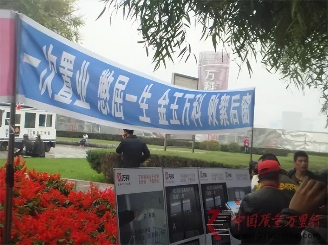 然而不过2年的时间,安信“毒”地板事件曝光,万科被牵连。同年,有深圳业主因为房子质量问题,带着花圈愤怒地来到万科梅林总部,挽联上写着:“哀悼万科已逝的品质”。