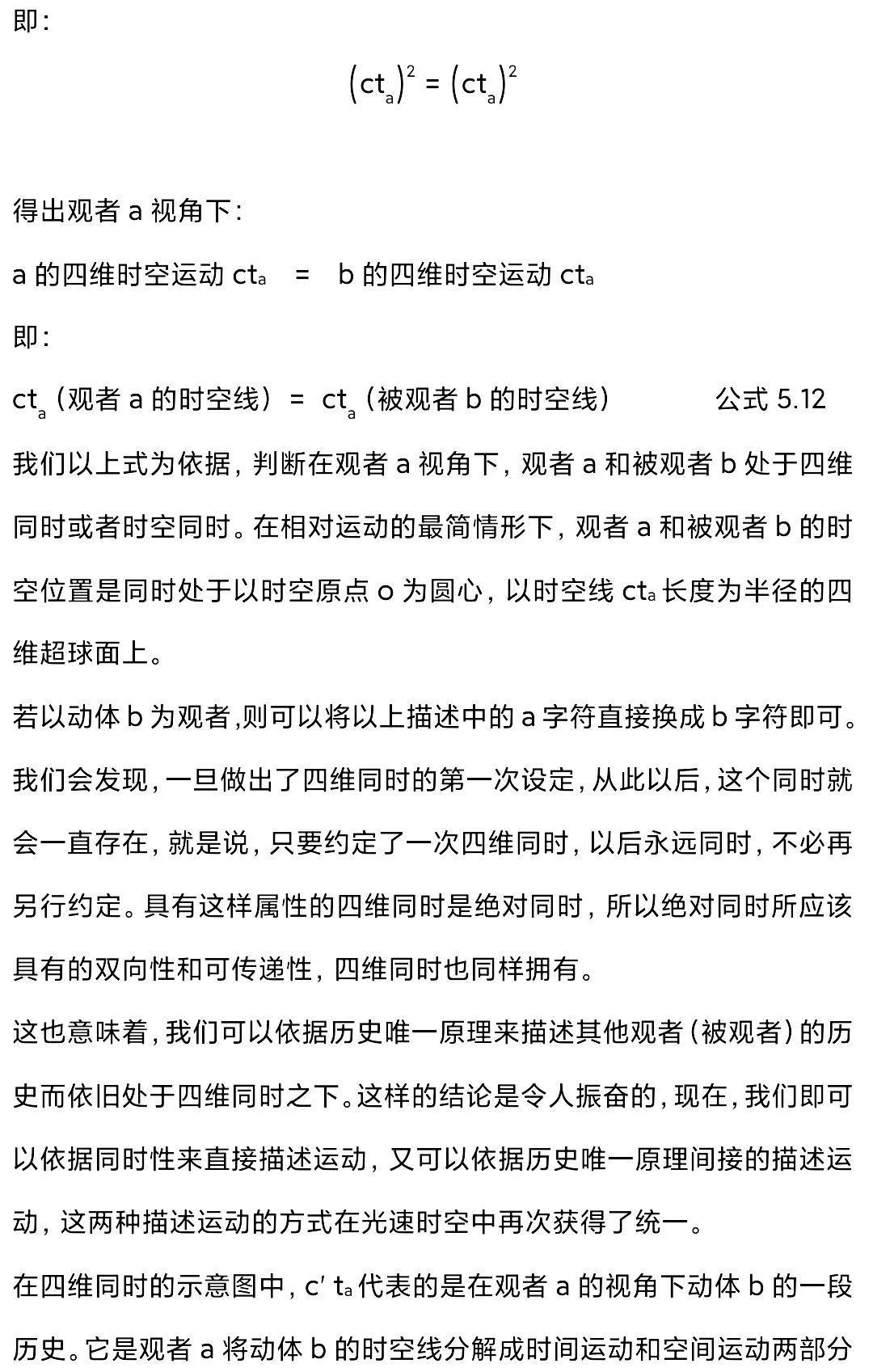 运动中的一部分。我们知道根据历史唯一原理,任何观者观测动体b的这段历史,都会观测到同样的结果。即c' ta是个坐标变换不变量。在第三章我们已经证明这个变换在光速时空中满足时空坐标变换。(在闵氏时空中满足洛伦兹变换)。