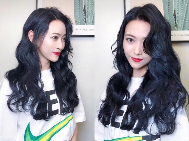 5、对于长卷发的女生来说,并且经常烫染头发的女生都会担心头发干燥的问题,那么这款蓝黑发色真心可以帮到你,染上就很显皮肤白的,配上微卷的发型,实在是太美了~
