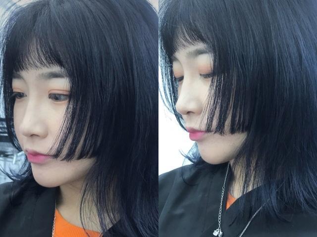 3、公主切的刘海发型是今年最新潮的发型之一了,并且它还可以帮你遮住脸蛋的肉肉,大脸女生必备的一款发型,配上外翘的短发发型,看着就给人一种很新潮的感觉,再搭配蓝黑发色,你不美谁美?
