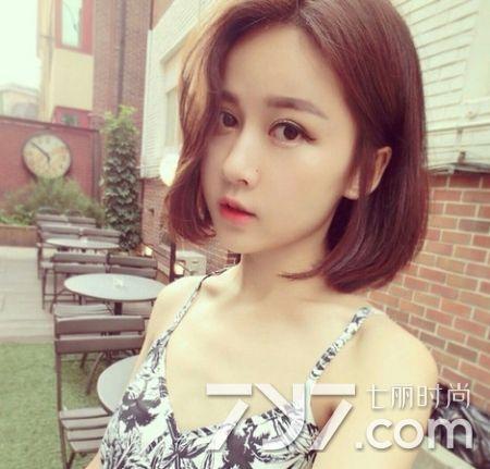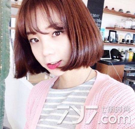 内扣设计的发尾衬托出妹子一张可爱的小脸,而且还能妥妥修颜显脸瘦。而露眉的短刘海与亚麻棕染发的搭配,更是让整个短发都充满了时尚与可爱气息,超惹人爱的。