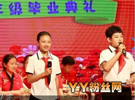 照片中,朱思潭与一位女孩子正主持六年级毕业典礼,颇有老爸朱军的主持范儿。