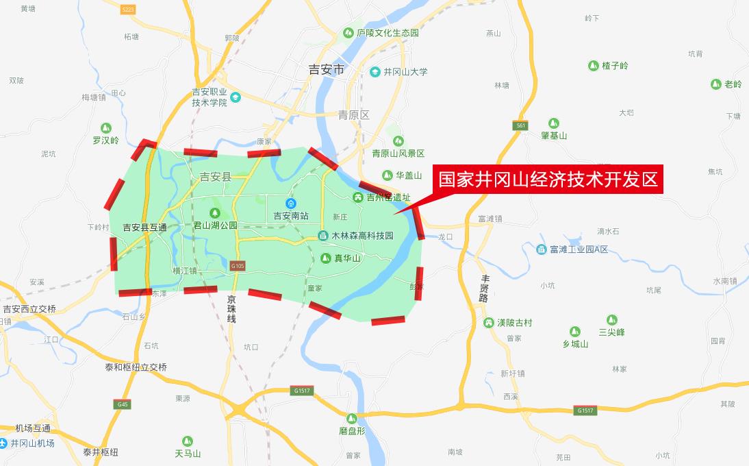 国家井冈山经济技术开发区位于江西省吉安市城南工业组团,总体规划面积46.5平方公里。自2010年3月经国务院批准设立后,相继获得国家加工贸易梯度转移重点承接地、国家科技兴贸创新基地、国家风电设备高新技术产业化基地、国家生物源农药高新技术产业化基地、国家台资企业转移承接基地、江西省电子信息产业基地、江西省重点工业园区等多项殊荣。