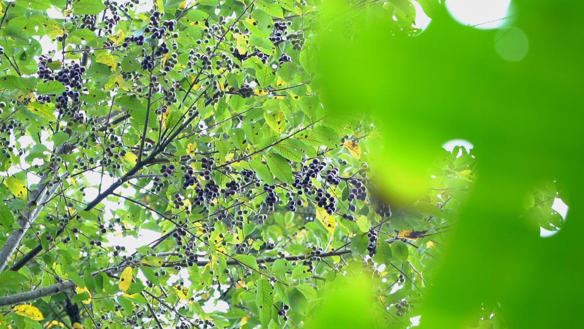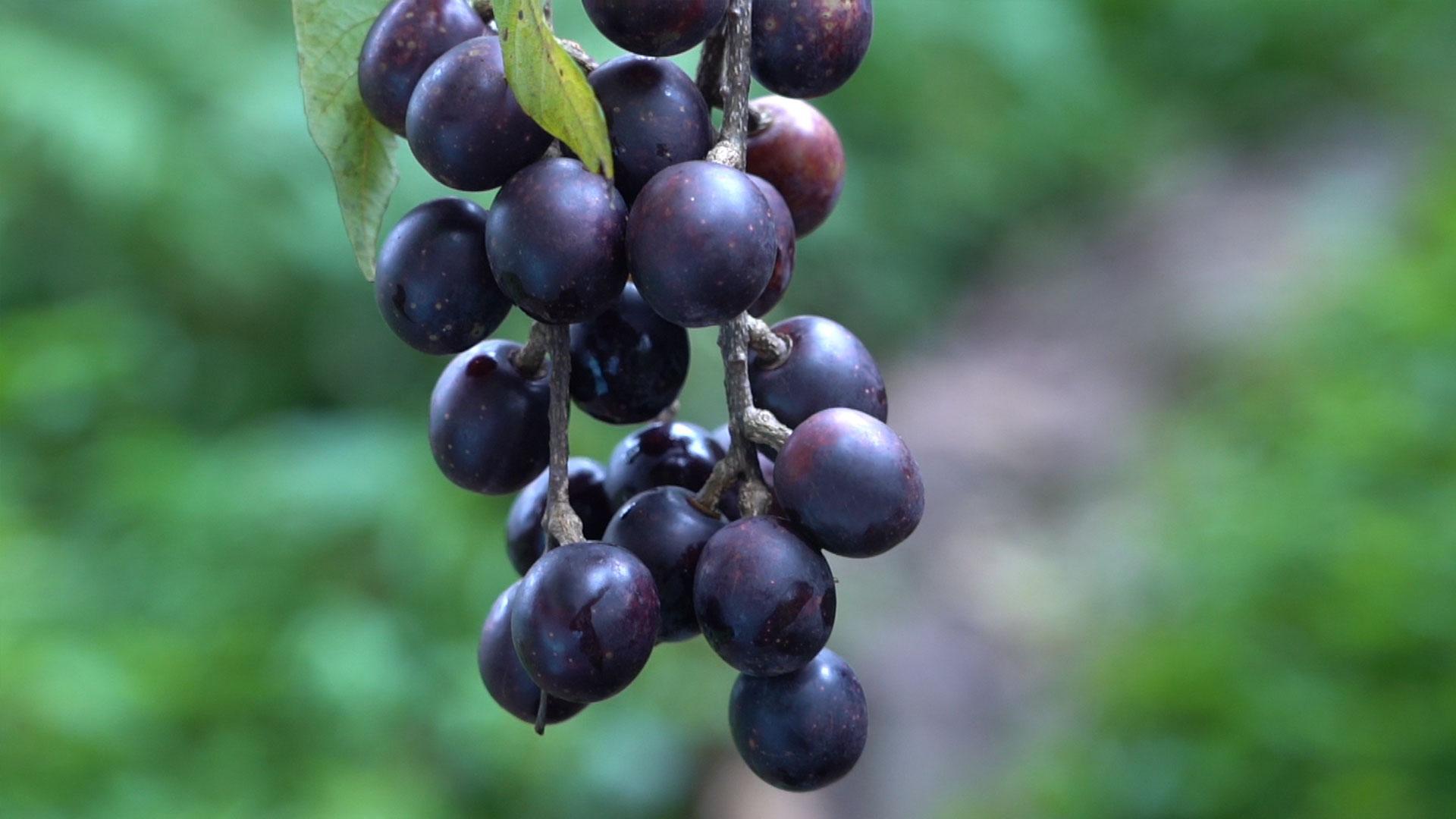 入秋,杨梅山村第一茬纯天然的胭脂果已开始成熟,漫山遍野都飘着淡淡的果香。“胭脂果”方言称“山李子,学名“粗梗稠李”,是一种高大笔直的落叶乔木,生长在海拔1200米至2500米的常绿树林中,果树通常要生长10年以上才会结果,最高能长到27米,因此采摘胭脂果也成为了一门技术绝活。