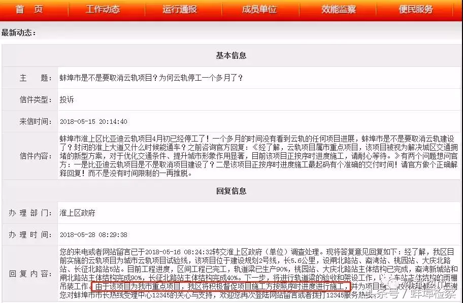 近日,有网友通过市长热线咨询蚌埠云轨项目的最新进展,得到了官方回复。