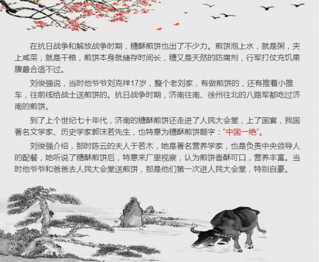 济南网·无线济南1月6日讯 上期《阿庆哥说济南》讲到了糖酥煎饼问世、普及的过程,不过,这还不是糖酥煎饼最辉煌的时候,您知道吗?咱济南的糖酥煎饼,被称为是“中国一绝”。这个名头是怎么来的呢?背后又有着怎样的传奇故事,本期《阿庆哥说济南》,咱们接着再说。