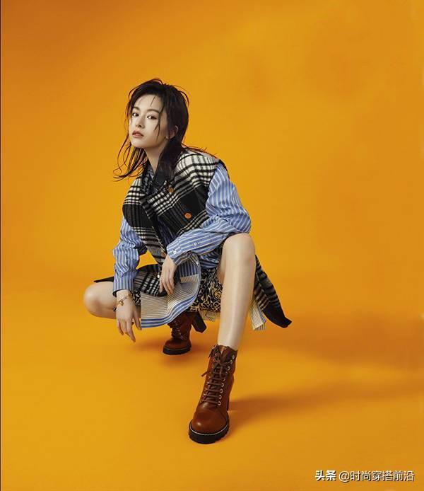 而除了这两种比较严酷的性感风格之外,这一组时尚大片,她另外一个风格也算是蛮吸引人的。一件造型特别别致的格子裙子。这件裙子的话就像是一件蓝色条纹衬衣搭配上一件黑白格子一样的叠穿,很有一种"百家衣"的感觉,不知道是哪位时尚大神设计的,要不是文咏珊这样子的女生,再配上这么一个随性不羁的发型,这个衣服还真的蛮难展示的。