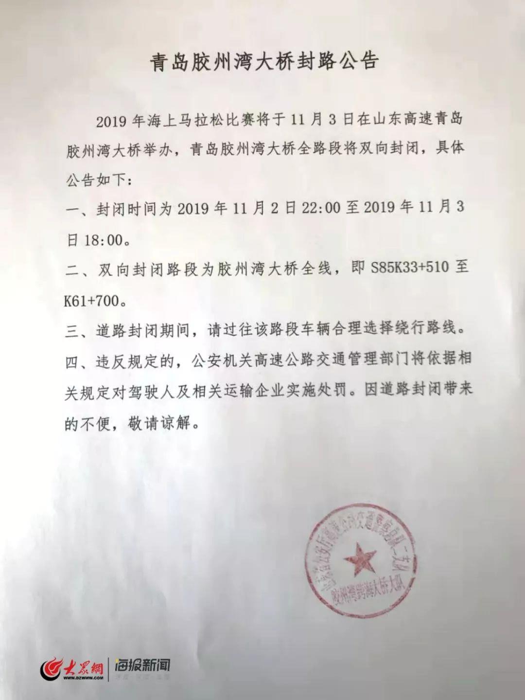 2019年海上马拉松比赛将于11月3日在山东高速青岛胶州湾大桥举办,青岛胶州湾大桥全路段将双向封闭,封闭时间为11月2日22:00至11月3日18:00。