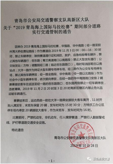 青岛市公安局交通警察支队高新区大队关于“2019青岛海上国际马拉松赛”期间部分道路实行交通管制的通告 因举办2019青岛海上国际马拉松赛,华强路、华中南路(经一路至胶州湾大桥收费站路段)作为赛道自2019年11月3日00:00—16:30封闭,禁止车辆停放;除持赛道通行证和消防、救护、应急抢险等车辆外,禁止其他车辆通行;岙东路(青兰高速南口以南路段)禁止大型货车通行;公交始发站(方特)调整到经二路(临近岙东路路口),临时取消邵哥庄以南站点;大洋一路作为持证大型车辆专用停车场、经二路作为公交车专用停车场,禁止其他车辆停放;经一路全路段、华中南路(经一路以北路段)作为社会中小型车辆停车场,依次顺向停放,在经一路的华中南路路口安排2辆赛事接驳客车往返送至经一路的岙东路路口;岙东路两侧禁止一切车辆停放,违者清障。2019年11月2日20时至3日20时高新区辖区内禁止危化品运输车辆通行。赛事结束后,运动员统一前往大洋一路乘坐接驳大客车离开,11时开始人满发车,末班车保留20辆,发车时间为15时30分;方特员工办公区停车场内停放20辆接驳大客车,作为末班车,发车时间为16时。比赛期间,严禁机动车、非机动车、行人横穿赛道;严禁行人翻越警戒线、护栏等道路交通安全设施。特此通告 青岛市公安局交通警察支队高新区大队2019年10月28日。