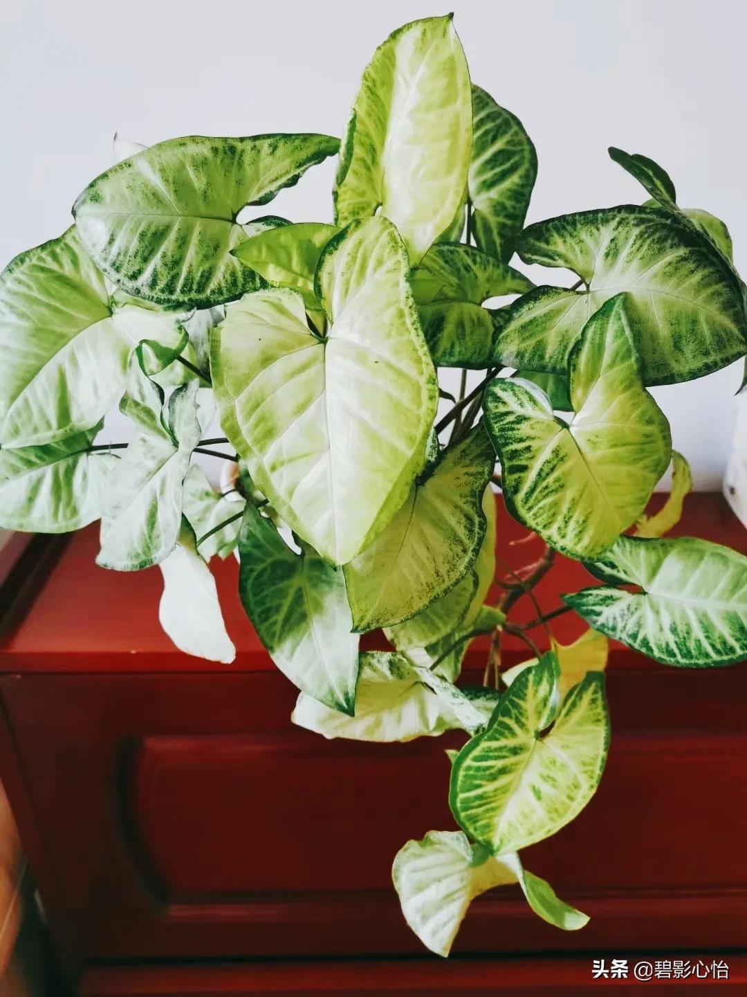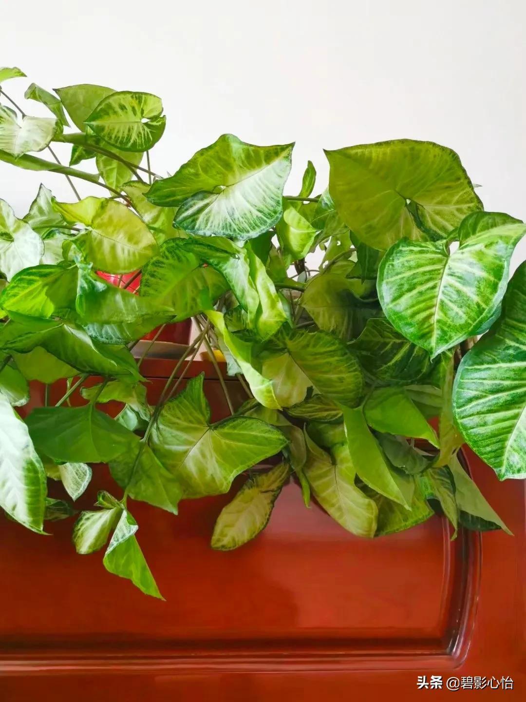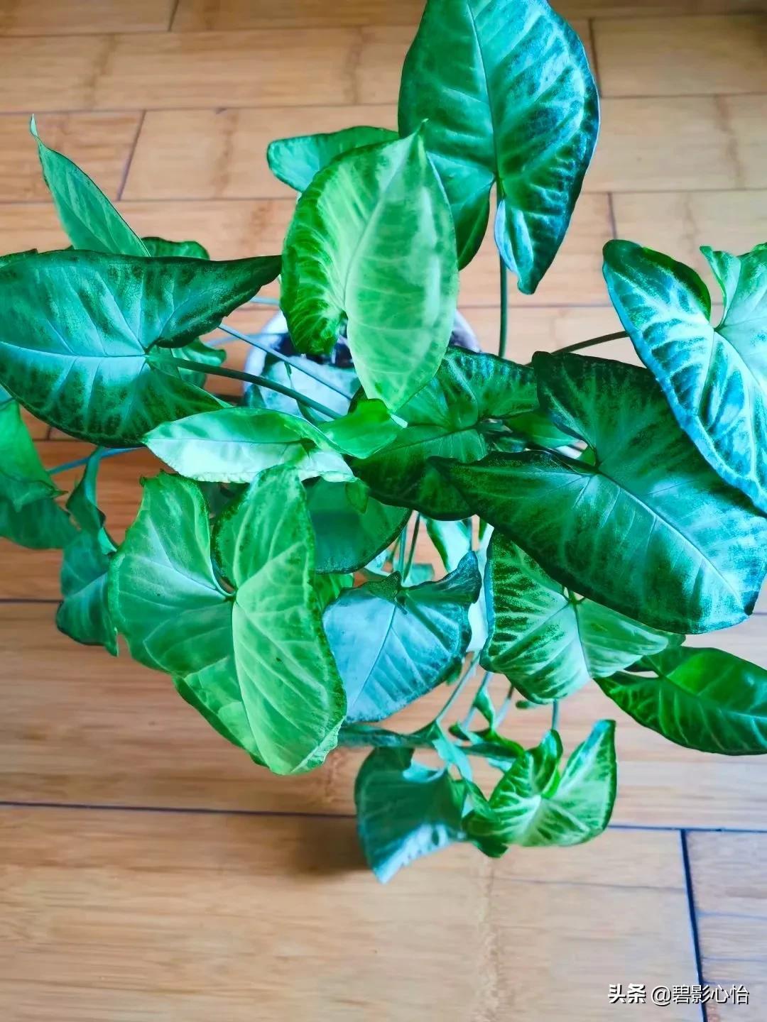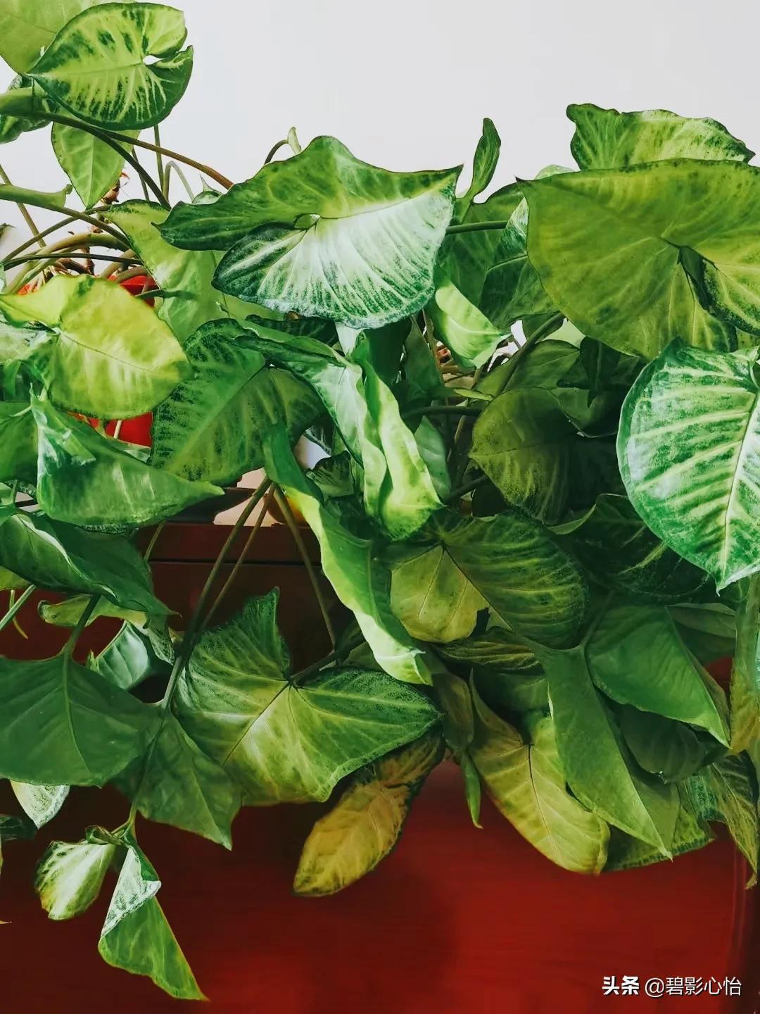 合果芋,是典型的观叶花卉,养好了,它叶片很大,有的叶片都比巴掌大,它叶片脉络相当清晰,每片叶子都像人体的肺子叶,株型也很美观,一年四季常青,很适合居室来养。
