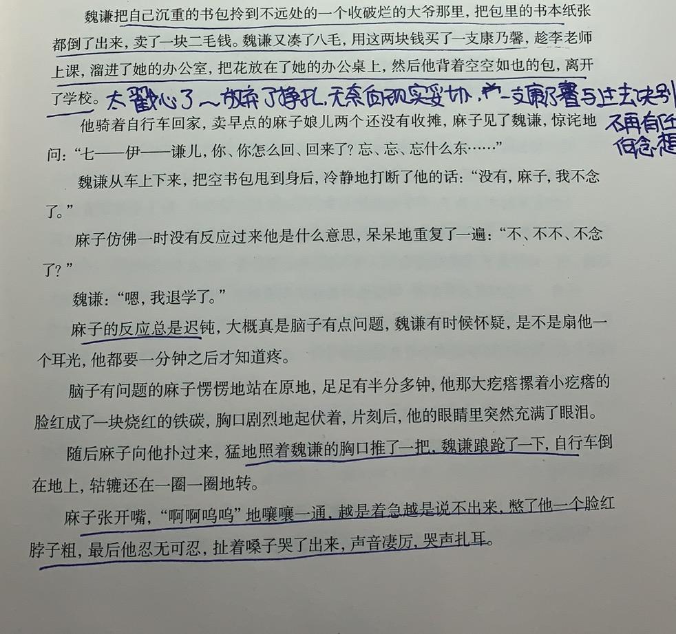 二.关于友情:魏谦决定退学的时候,把所有的书本卖了一块二毛钱,又凑了八毛,买了一支康乃馨,趁李老师不在的时候,悄悄放在老师的办公桌上,背着空空如也的书包,离开了学校。他没有哭,甚至连眼眶都没有泛红,但是麻子哭了,哭得撕心裂肺,声嘶力竭,哭得忘乎所以~