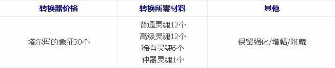 魔纹石、纯净的斗气浓缩石、忠诚/坚韧/勇气纹章石和塔尔玛的标志功能都由塔尔玛的象征代替.现有的斗气装备相关材料可以在NPC商店处按一定比例兑换为塔尔玛的象征.