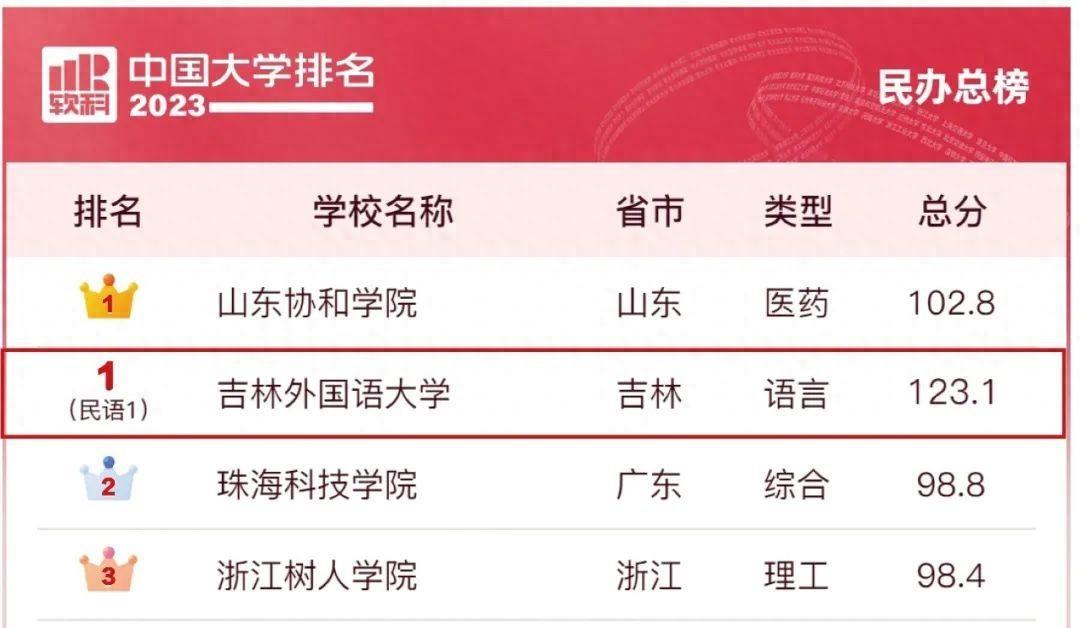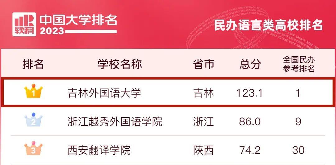 3月30日,高等教育专业评价机构软科正式发布“2023软科中国大学排名”。吉林外国语大学在“2023中国民办高校总榜”排名第一。同时,在新增加的“2023中国民办语言类高校排名”中,吉林外国语大学排名第一。