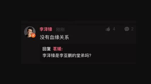 不过,李泽锋后来做客某访谈时,在回答网友提问环节亲自否认了这一传言。当有网友问他是不是李亚鹏的堂弟时,他直接回复“没有血缘关系”,既然没有血缘关系,所谓“亲侄子”的说法也不攻自破。
