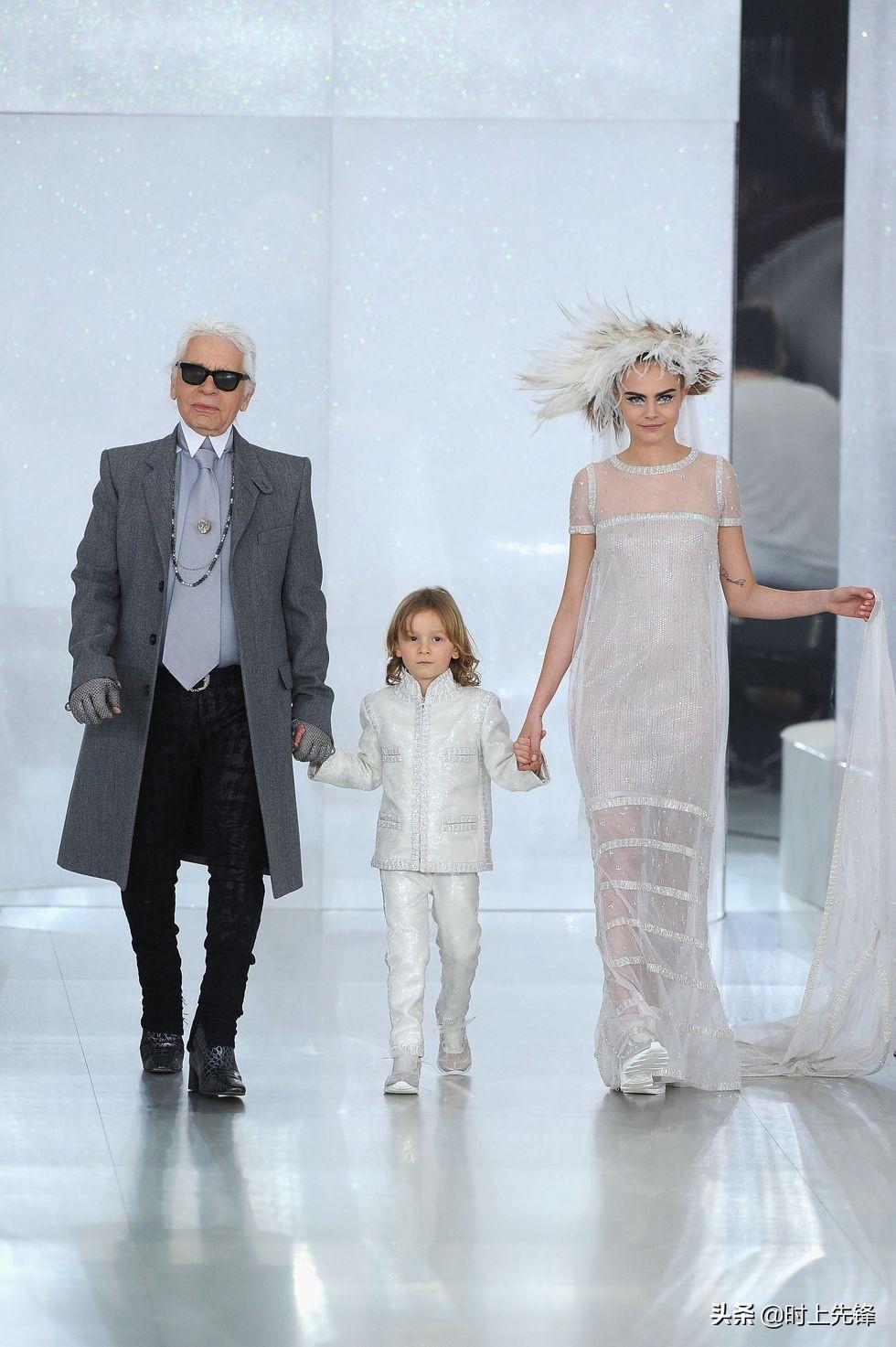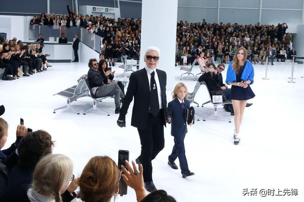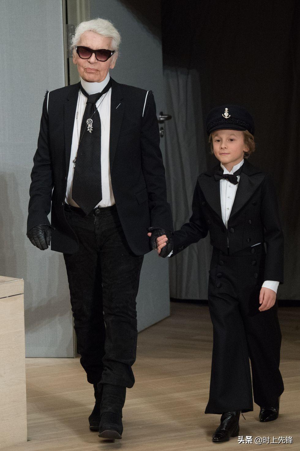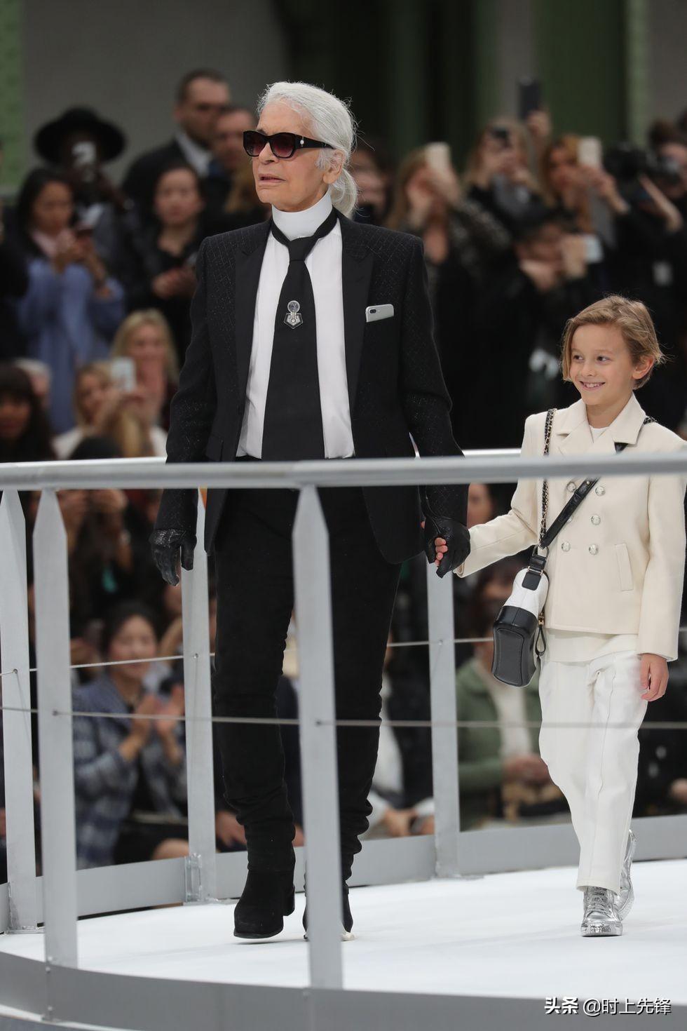 老佛爷Karl带着身穿白色西装,脚踩银色休闲鞋的9岁Hudson,现身Chanel2018 秋冬时装秀的终场致意。