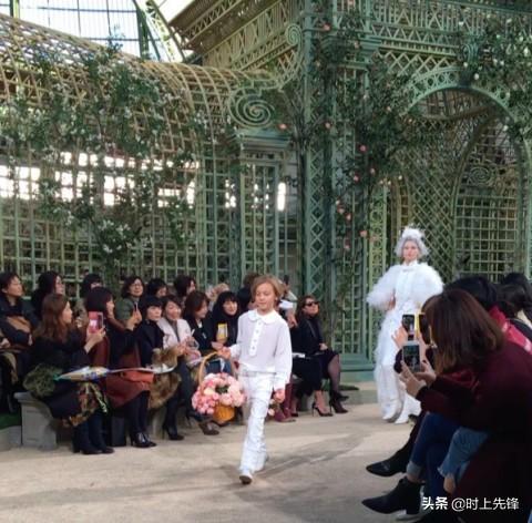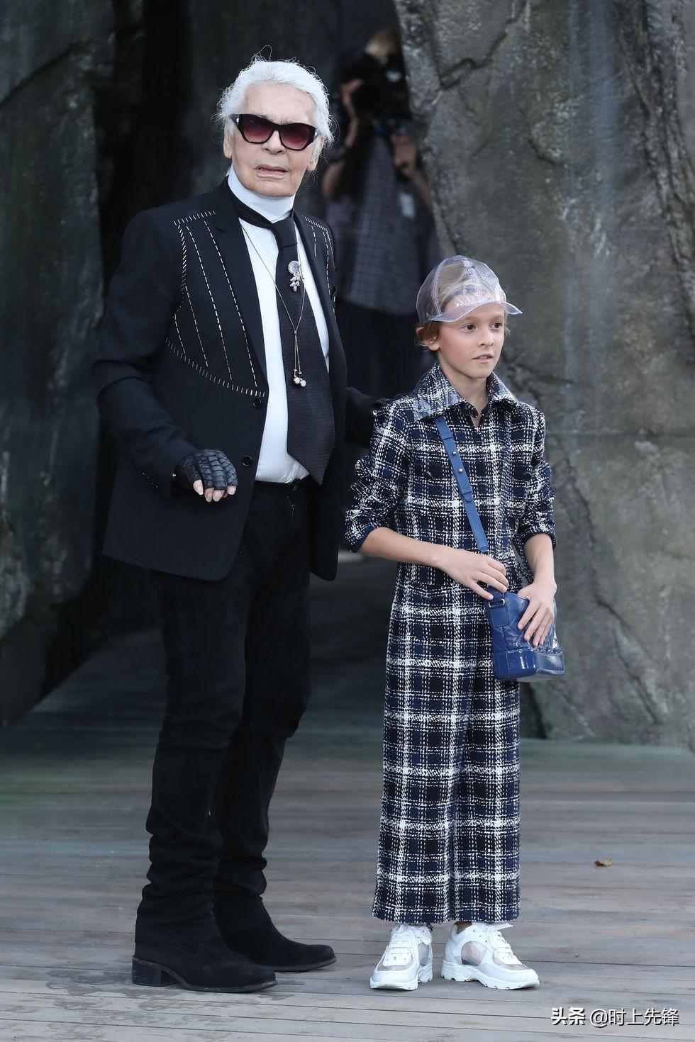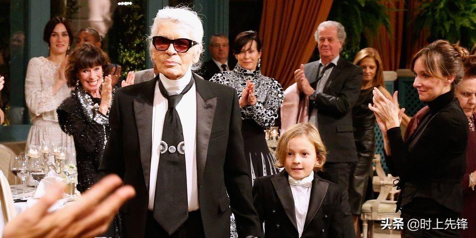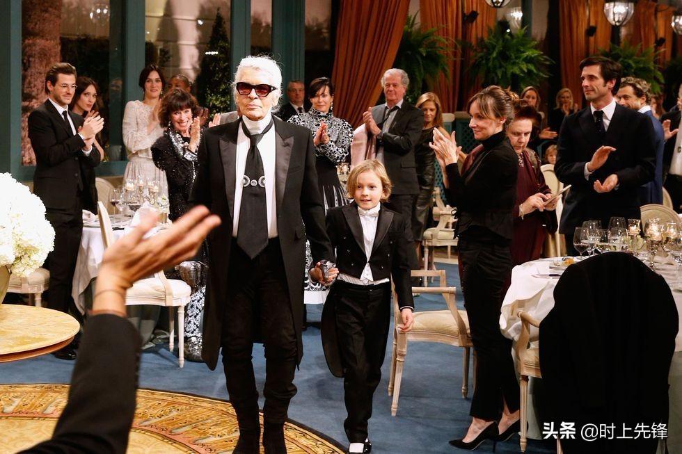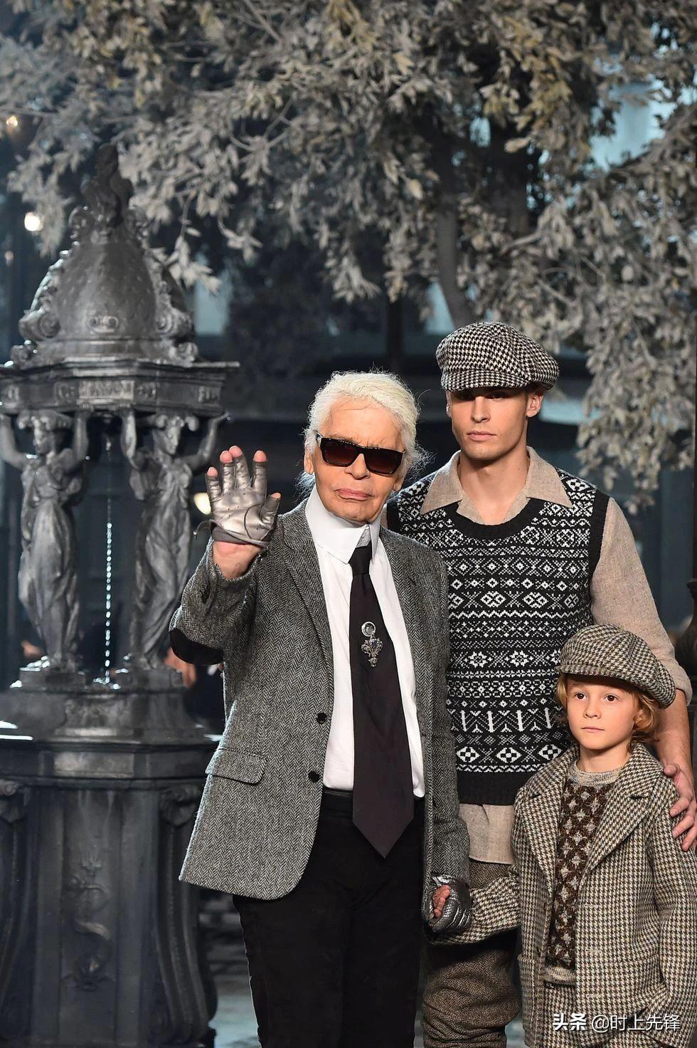 老佛爷Karl带着身穿白色西装,脚踩银色休闲鞋的9岁Hudson,现身Chanel2018 秋冬时装秀的终场致意。
