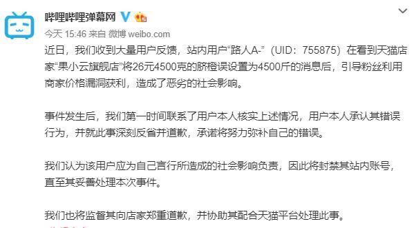 7日下午,哔哩哔哩弹幕网表示,站内用户“路人A-”在看到天猫店家“果小云旗舰店”将26元4500克的脐橙误设置为4500斤的消息后,引导粉丝利用商家价格漏洞获利,造成了恶劣的社会影响。因此将封禁其站内账号,直至其妥善处理本次事件。