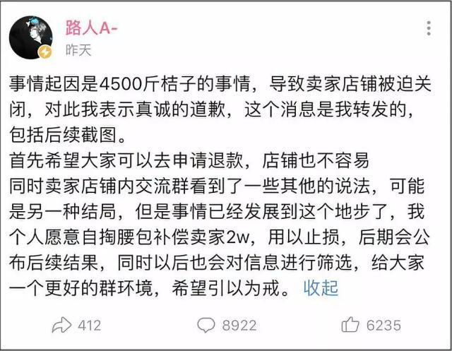 B站网友@小帅喵萌萌哒爆料,当时,“路人A-”发现了“果小云”店铺操作失误后,带领1万粉丝,以每单26元的价格购买4500斤水果,一晚上下了10几万个订单。