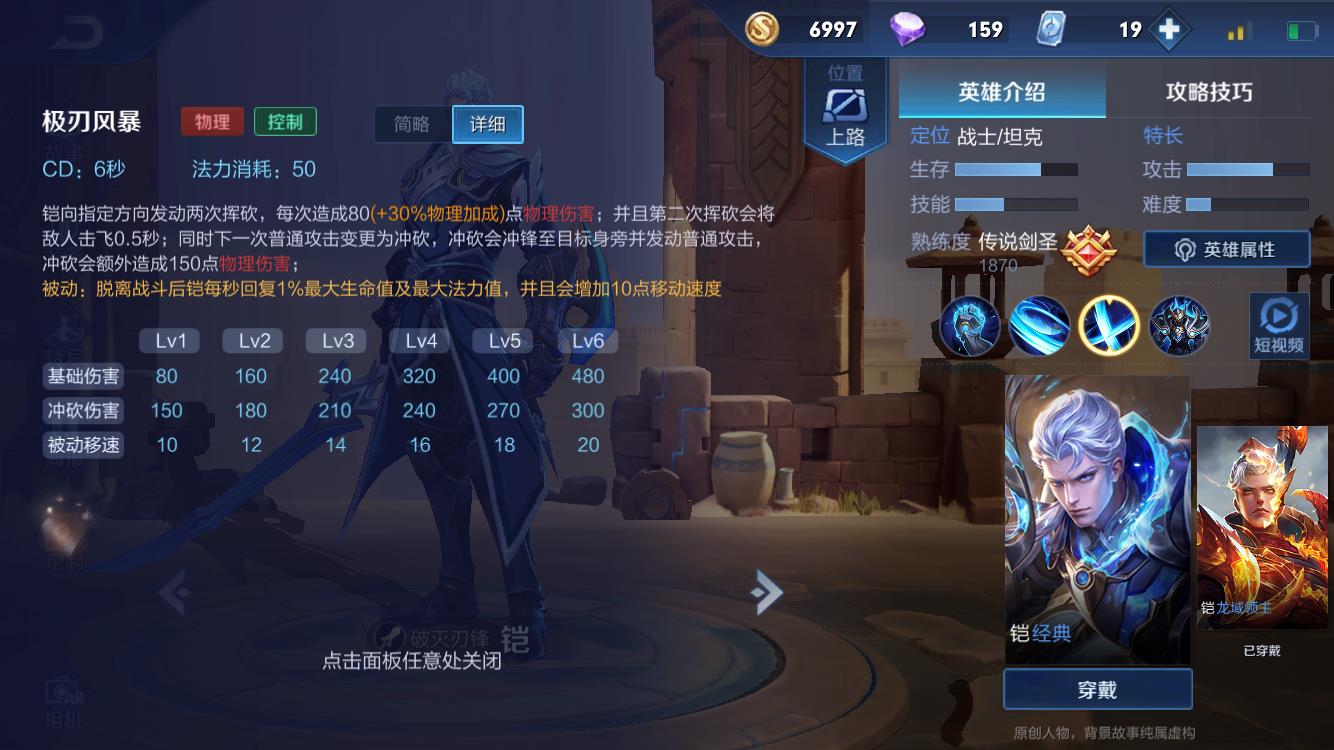 二技能:极刃风暴,凯向指定方向发动两次挥砍,每次造成80(+30%物理加成)点物理伤害;并且第二次挥砍会将敌人击飞0.5秒;同时下一次普通攻击并更为冲砍(在这里可能部分玩家会有误解,误以为凯的二技能是三段连击,其实不然),冲砍会冲锋至目标旁并发动普通攻击,冲砍会额外造成150点物理伤害;被动;脱离战斗后凯每秒回复1%最大生命值及最大法力值,并且增加10点移动速度。