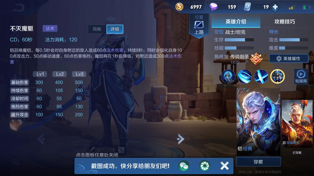 三技能:不灭魔躯,凯召唤魔铠,每0.5秒会对自身附近敌人造成60点法术伤害,持续8秒,同时会强化自身100点攻击力、50点移动速度、60点伤害格挡,魔铠将在1秒后降临,对附近造成300点法术伤害。