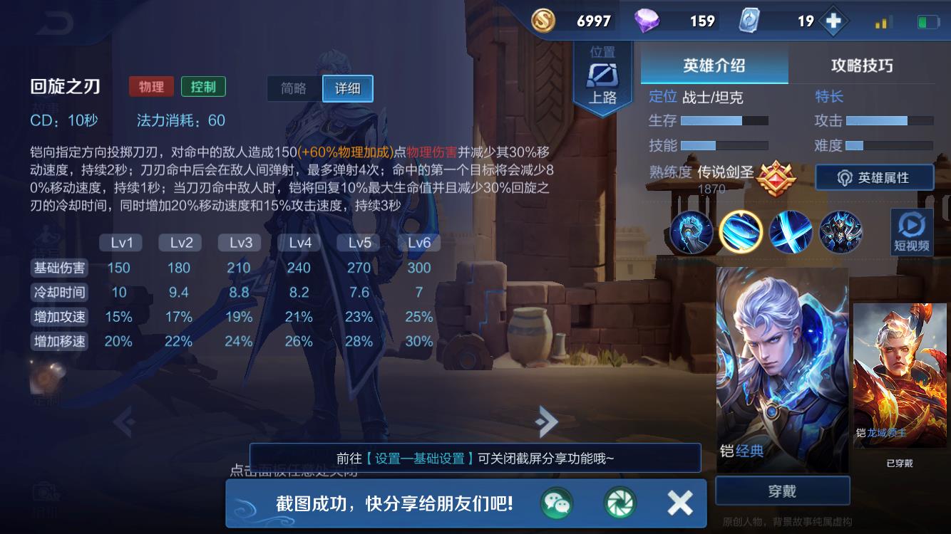 一技能:回旋之刃,凯向指定方向投掷刀刃,对命中的敌人造成150(+60%物理加成)点物理伤害并减少其30%移动速度,持续2秒;刀刃命中后会在敌人间弹射,最多弹射4次;命中的第一个目标将会减少80%移动速度,持续1秒;当刀刃命中敌人时,凯将回复10%最大生命值并且减少30%回旋之刃的冷却时间,同事增加20%移动速度和15%攻击速度,持续3秒。