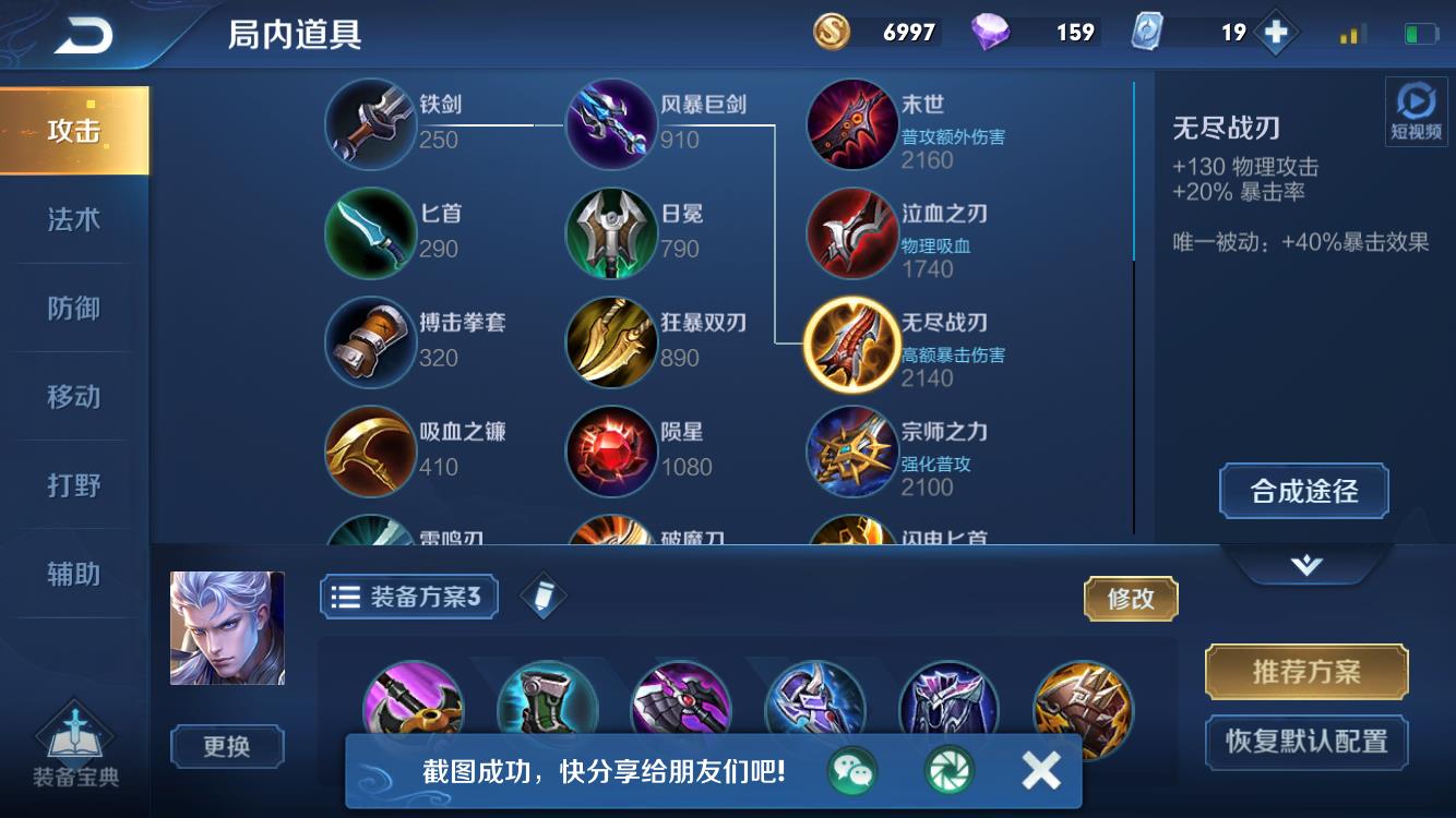 出装方面:强烈建议将无尽之刃、暗影战斧为主要核心。建议第一件装备先出暗影战斧,看战况在第2-3件装备时再出无尽之刃。