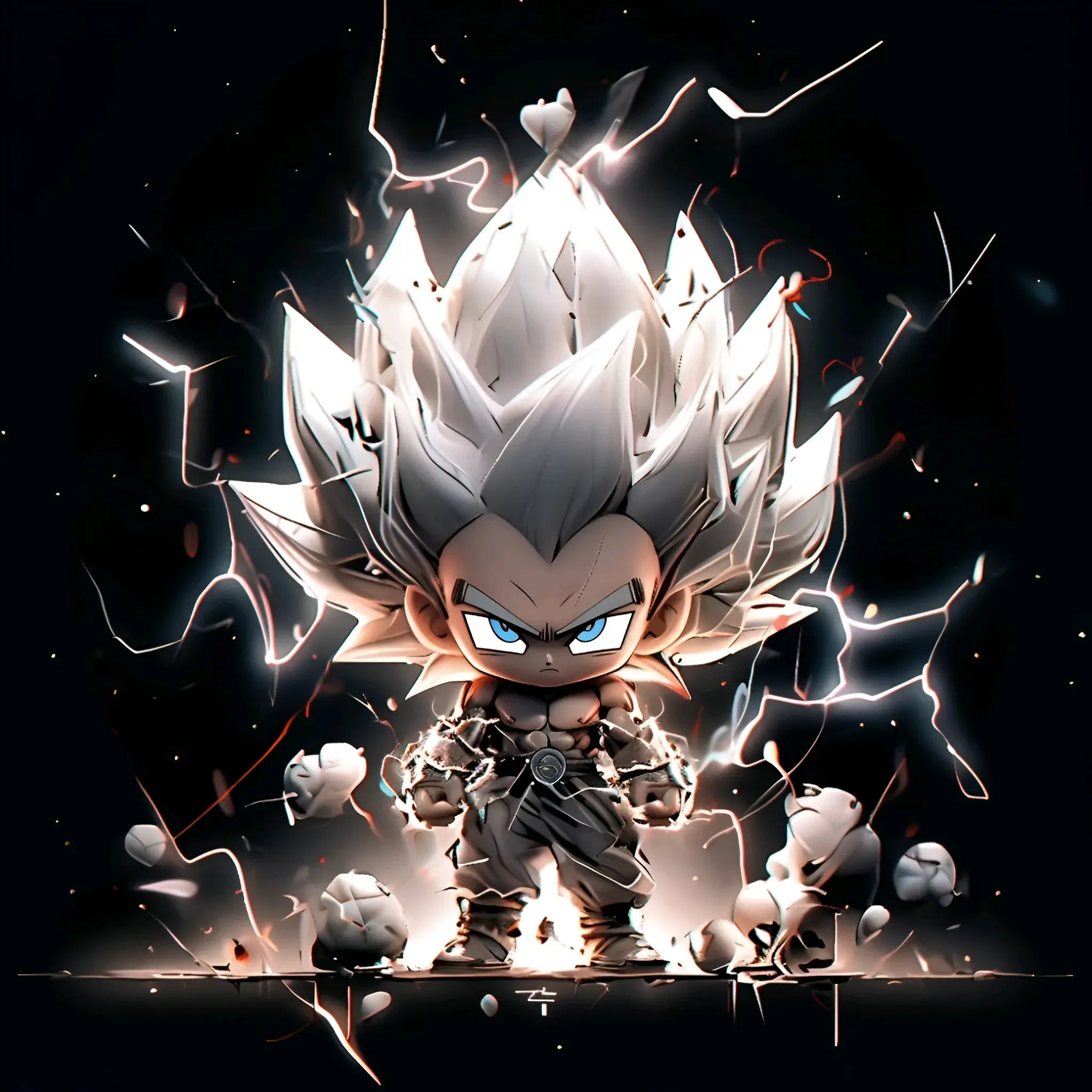 在一个黑暗的世界里,有一个超级无敌赛亚人,他的头非常大,是 Q 版的形象,看起来非常可爱。他的白色头发干净整齐,耳朵透明,身上穿着黑色的衣服,闪烁着闪电。