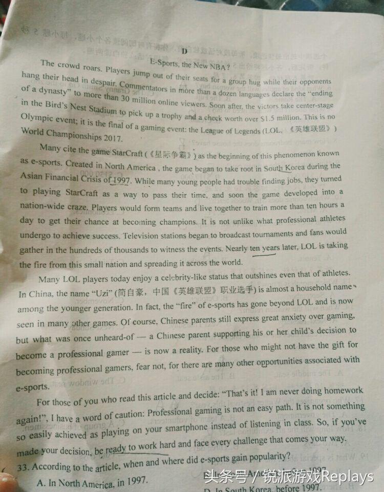 近日,一位LPL粉丝在微博分享了这样一张截图,图中内容为高中全国卷英语阅读理解D篇,其中RNG战队Uzi的名字“简自豪”出现在其中,题目为《电竞,下一个NBA?》,该LPL粉丝看到考卷后不禁感叹:“电竞的影响力已经这么广了吗”