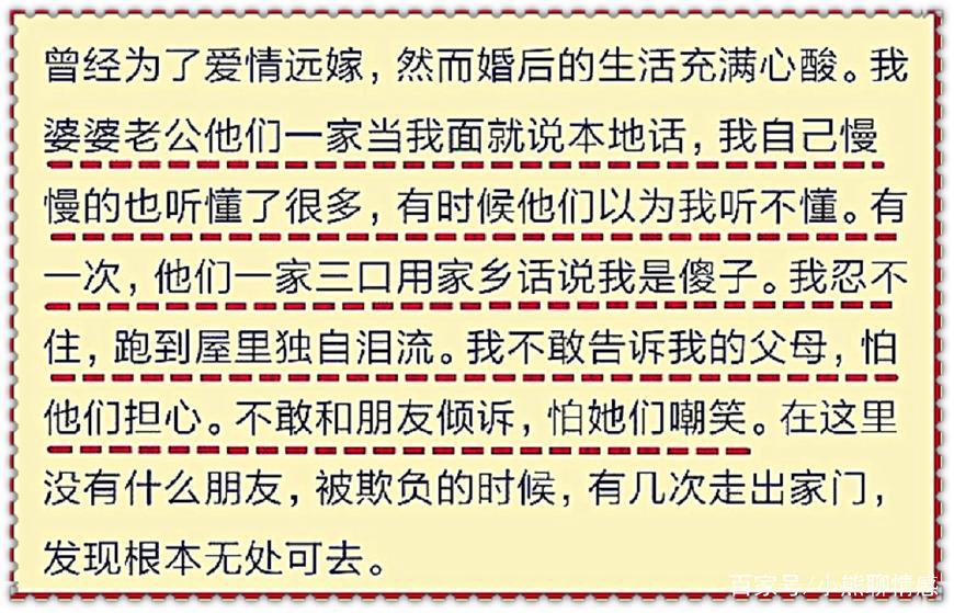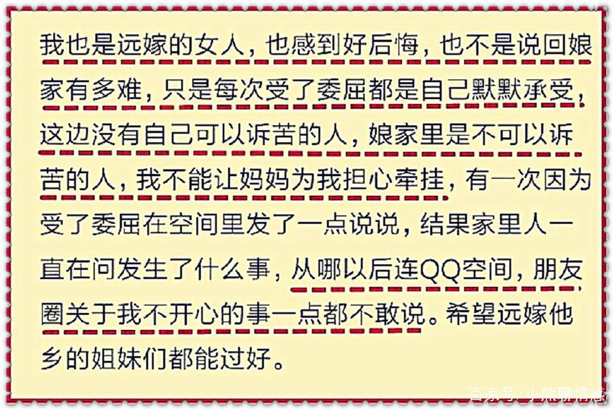 2、我们现在就算说破天,远嫁这不好那不好,对于那些想远嫁的女性来说,她们还是想嫁过去,只有经历,才会醒悟。现实就这么残酷,那些远嫁了的,哪一个父母朋友不是在她们结婚前苦口婆心,又有几人能听?