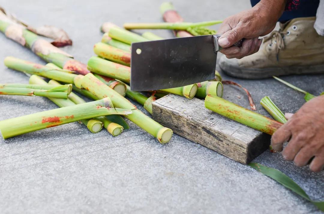 采芦粟的人,一般都会带着砍刀,方便对芦粟切割分段,只见手起刀落,削去嫩梢,撕了叶子,砍下老根,将芦粟剁成一节节。牙齿咬住顶端,撕扯去皮后,便可直接食用。咬一口,嚼几下,脆生生,甜津津,甜汁嚼的满嘴,沁人心脾,实在解渴。