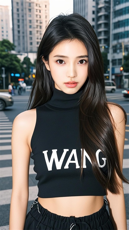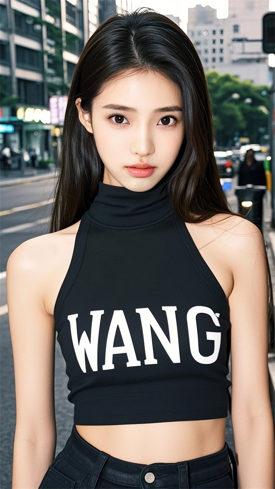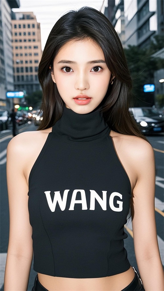 黑色上衣上的大写“WANG”字母图案,简约又极具辨识度,增强了整体造型的时尚感。这种风格带有一丝街头风的元素,仿佛在宣示着她不拘一格的个性与自信。她的长发自然地垂落在肩头,随风微微飘动,增添了一丝随性与洒脱的气息。这种自然的状态,使得她看起来不仅时尚,还非常接地气,让人觉得她并不是那种高高在上的冷美人,而是可以亲近、交谈的都市女孩。