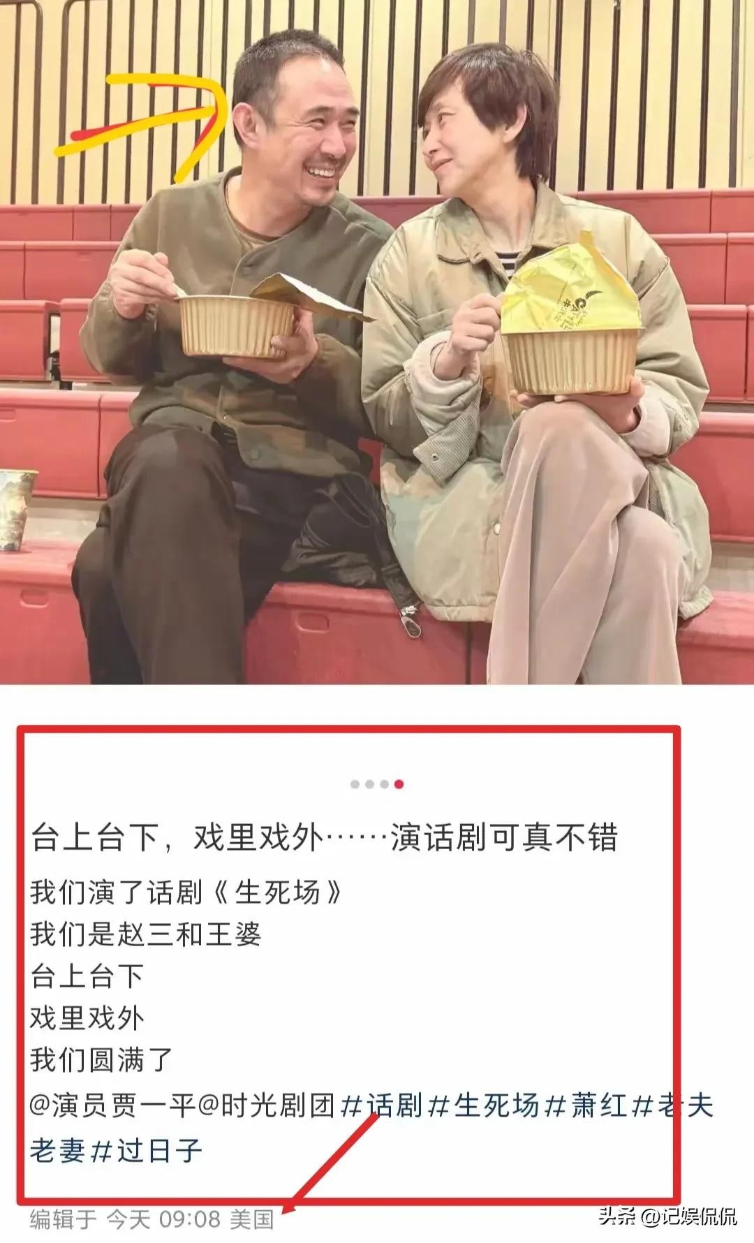 据悉,这张照片是夫妻俩演完话剧后,在台下吃饭的定格画面。