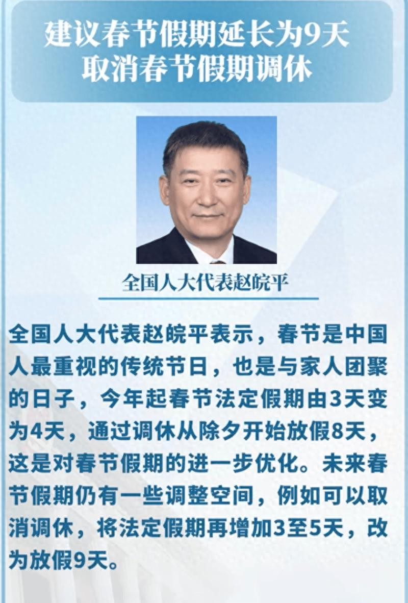 赵皖平认为,未来春节假期仍有一些调整空间,例如可以取消调休,将法定假期再增加3至5天,改为放假9天。