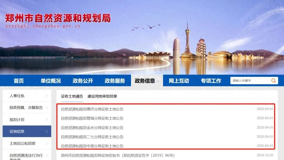 4月1日,郑州市自然规划局官网更新了2025年征收土地公告,其中牵涉到惠济区、管城区、金水区等核心区域。
