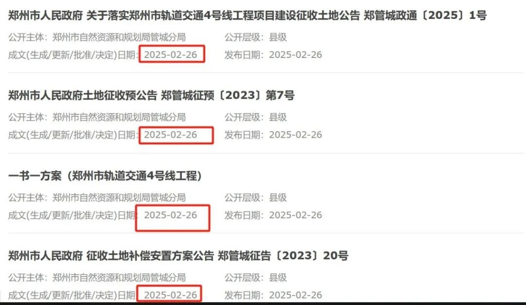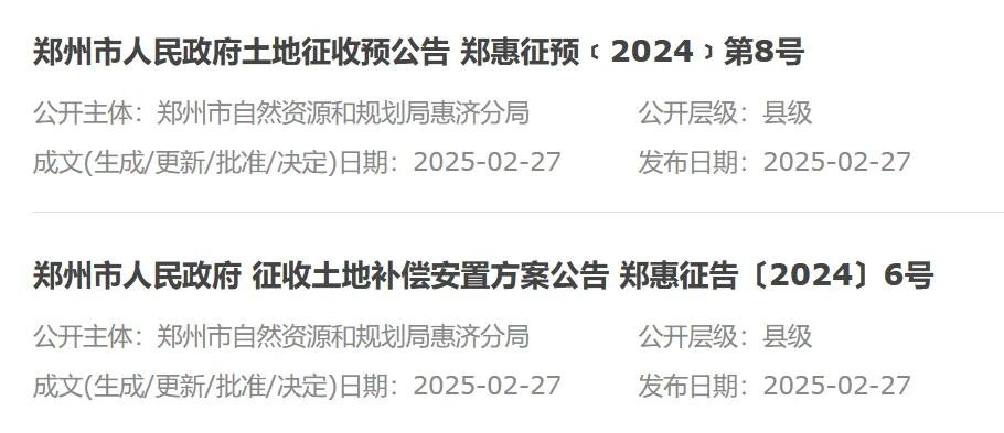 小安先补充说明:据查询,虽然郑州市自然规划局主页显示,征地公告更新时间为4月1日,但点击后显示的征地公告发布时间为2025年1-2月。4月1日只是对2025年的征地公告进行了批量更新。