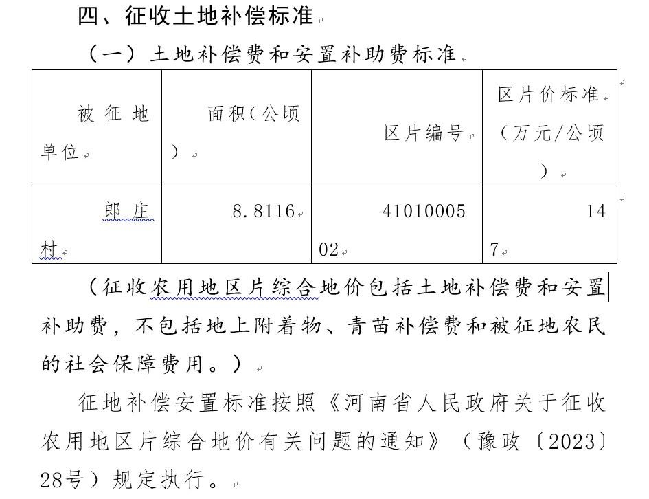 征收土地补偿标准为147万元/公顷;社会保障费用标准为93.93万元/公顷;青苗补偿标准为2.25万元/公顷。