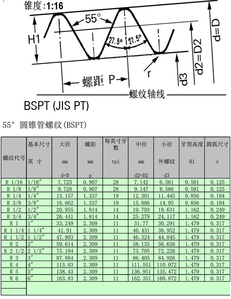 PT 英文Pipe Thread的首字母缩写,是 55 度密封圆锥管螺纹,属惠氏螺纹家族,多用于欧洲及英联邦国家。常用于水及煤气管行业,锥度规定为 1:16。它的基本单位是英寸(1英寸=25.4毫米)。英制管螺纹是细牙螺纹,因为粗牙螺纹的牙深大,会严重的降低所切螺纹外径管子的强度。PT螺纹具有自密封性,也就是它不需要使用密封剂,拧紧后就可以起到密封的作用。