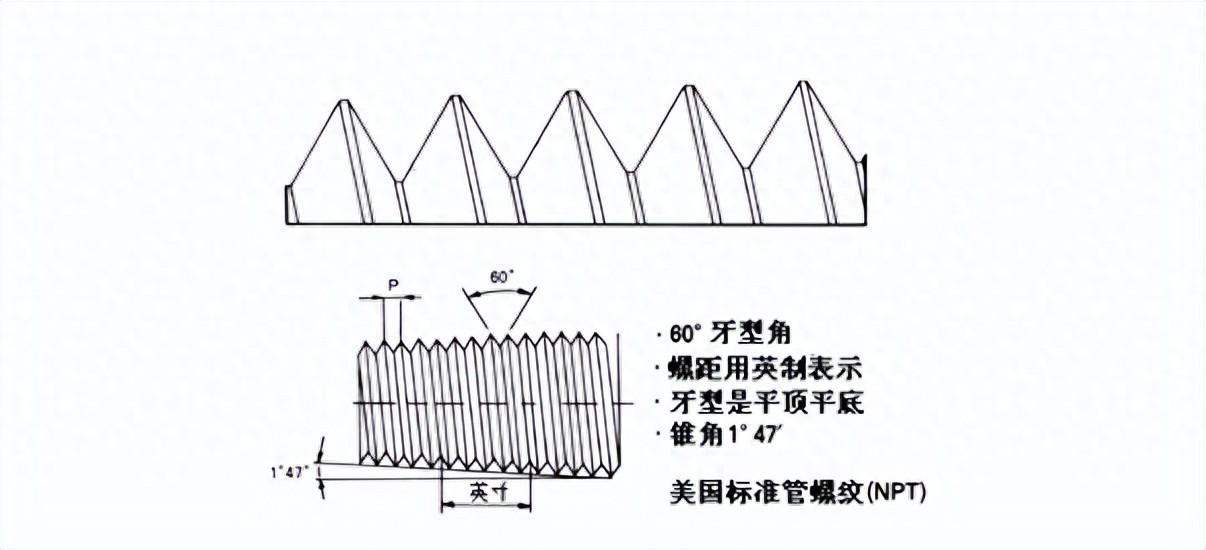 NPT 是 National (American) Pipe Thread 的缩写,属于美国标准的 60 度锥管螺纹,用于北美地区.国家标准可查阅 GB/T12716-1991。它的基本单位是英寸(1英寸=25.4毫米)。N代表美国国家标准、P代表管子、T代表螺纹(也理解为TAPER锥形),都是英文的首字母缩写。NPT是一般用途的锥管螺纹,本身不具有密封性,需要使用密封剂如87胶、生料带等来保证密封。当密封要求严格时,密封剂可能由于高温高压会失效。