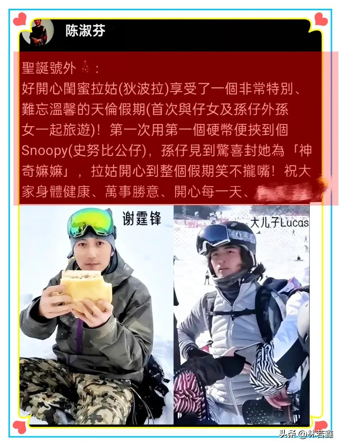 张柏芝跟谢霆锋结婚五年生了两个儿子,大儿子谢振轩今年17岁,长的跟谢霆锋很像,时不时的会跟谢霆锋出去滑雪,前段时间还跟谢霆锋,还有谢霆锋妈妈狄波拉,以及谢霆锋妹妹一起出去度假,看得出来,虽然谢振轩是张柏芝一手带大,可是跟爸爸家的亲戚关系都很好!