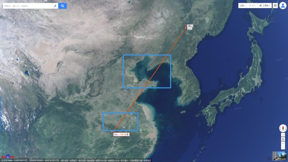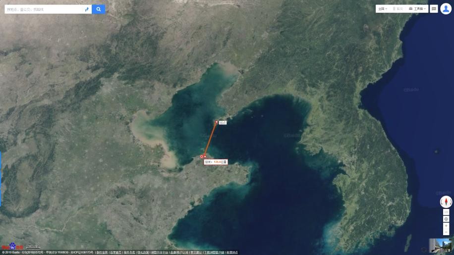 由于“东海”现已消失不好确认,所以我们以渤海湾的距离来验证一下: