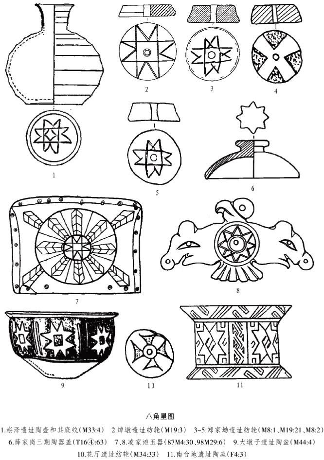 广布华夏大地的的八角星图案,从南往北的高庙文化、汤家岗文化、良渚文化、凌家塘文化、大汶口文化、红山文化等都有发现: