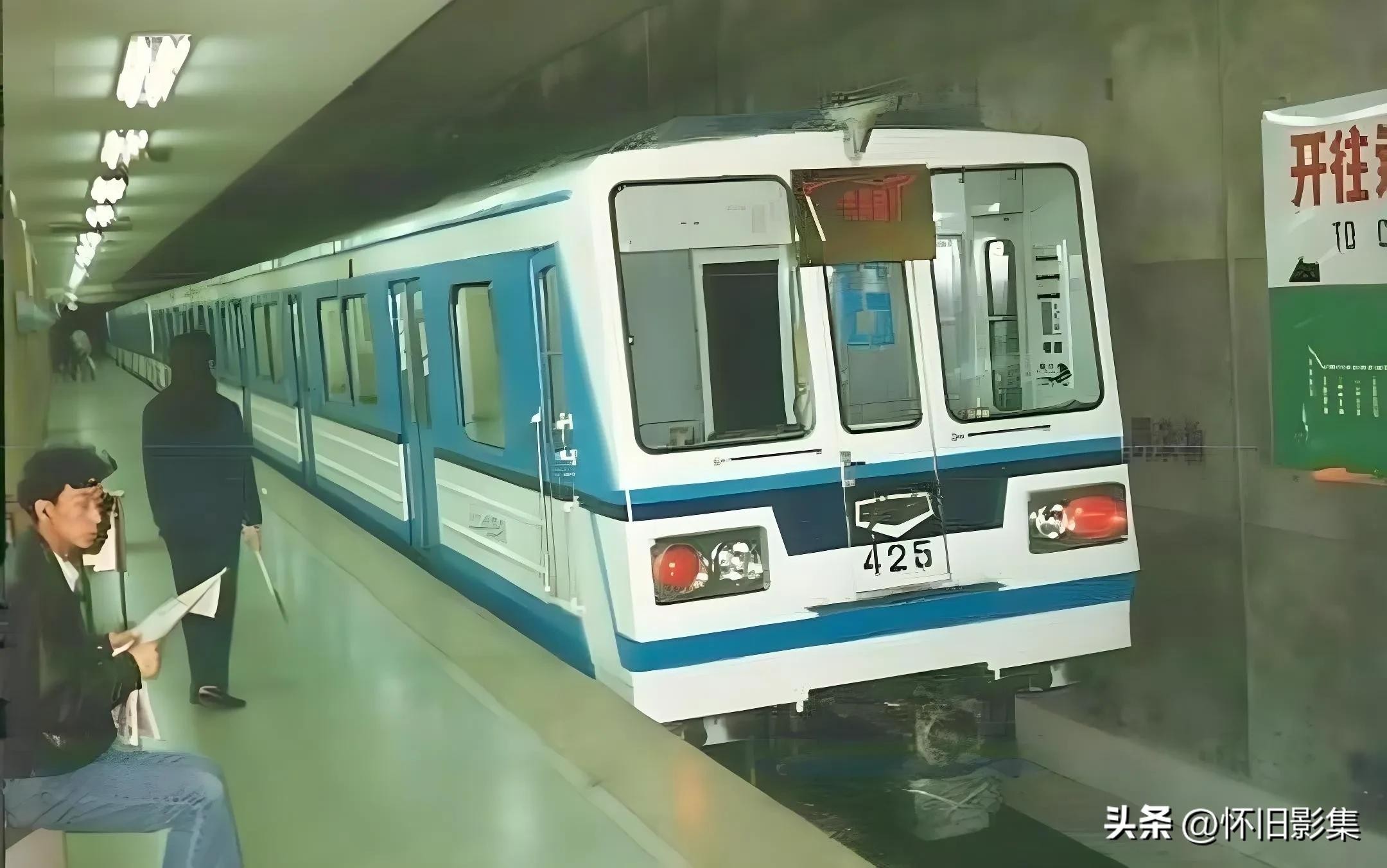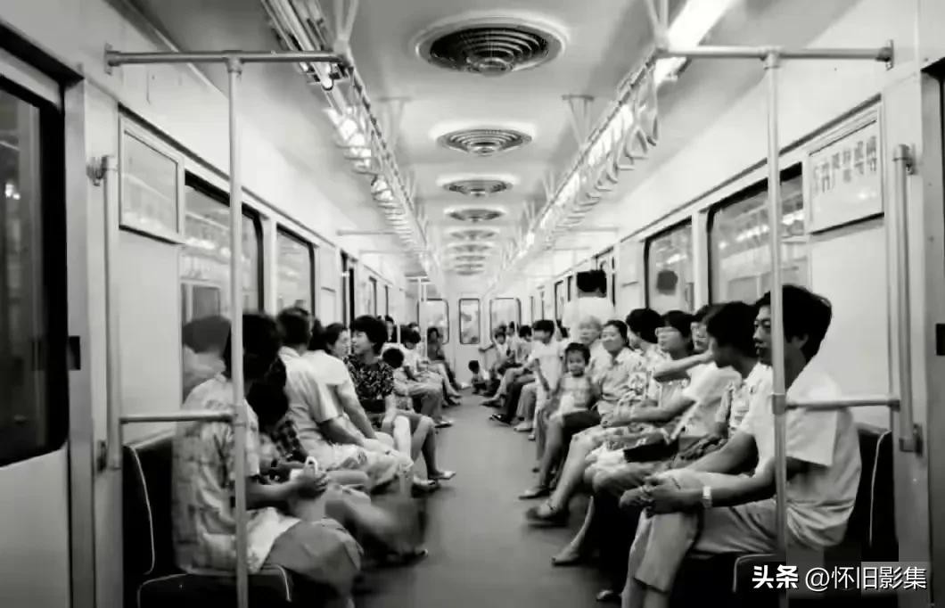 这是一张记录北京地铁二号线开通初期场景的黑白照片。车厢内乘客分布不均,画面中近处这节车厢里人人有座,乘客们或坐或看向别处;而从描述可知另一节车厢则有很多人没座。照片展现了当时地铁内的乘车状况,也反映出城市公共交通发展特定阶段的情形。