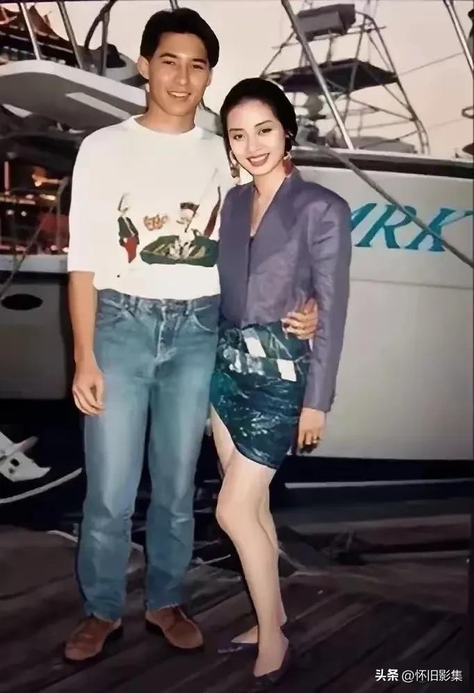 这是梅艳芳与前男友刘米高在上海的合影老照片。照片中的梅艳芳身着紫色上衣搭配闪亮短裙,笑容灿烂,面露幸福。身旁的刘米高穿着白色印花T恤和牛仔裤,两人站在一处有船只背景的地方,整体画面展现出特定时期的氛围。梅艳芳是香港乐坛和影坛的传奇人物,她的感情生活也常受关注。