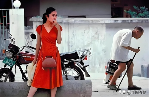 1992年,深圳福田车公庙食街附近,发生了极具时代感的一幕。一位留着乌黑长发、扎着马尾辫的小姐姐,身着一袭红裙,脚蹬白色高跟鞋,正惬意地吃着雪糕。此时,一位提着录音机的驼背大爷从她身后路过。这一瞬间,被玛格南图片社的摄影师敏锐捕捉,定格成了经典画面,尽显90年代的时髦风情 。