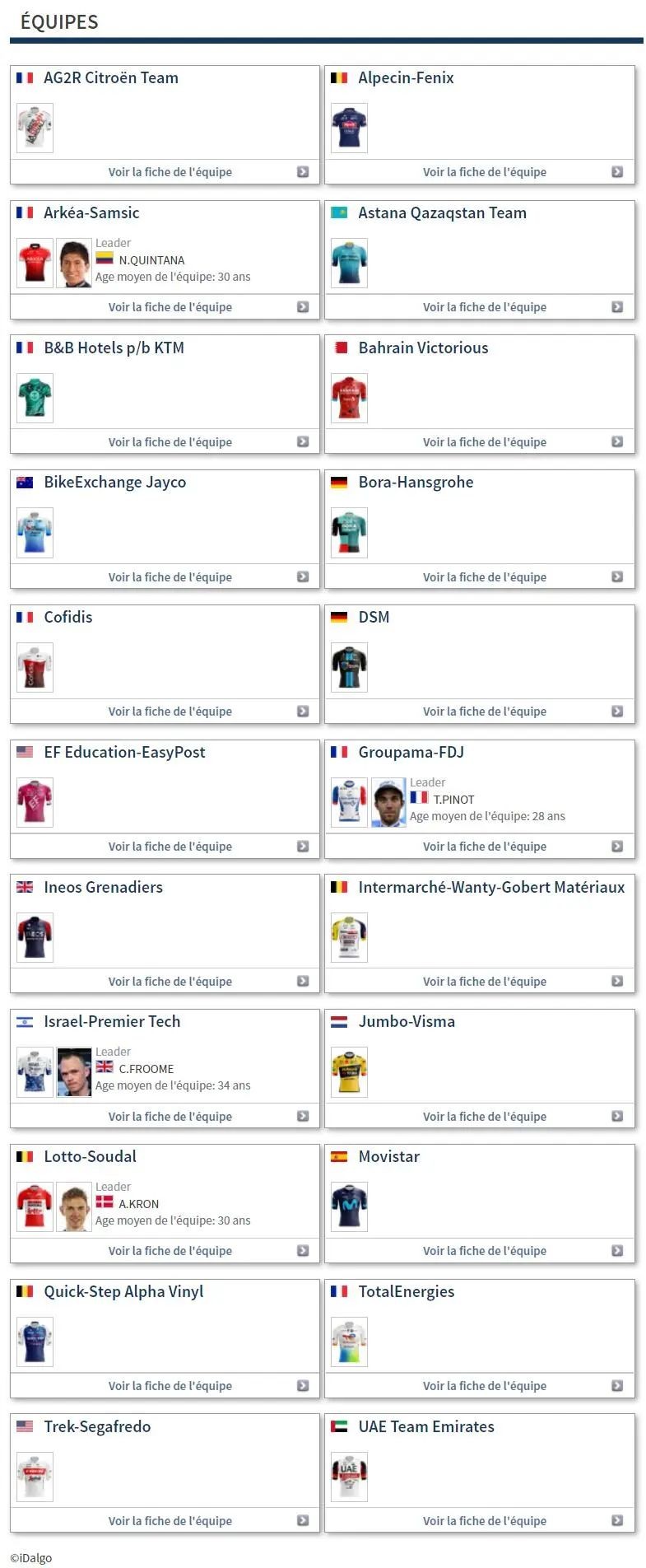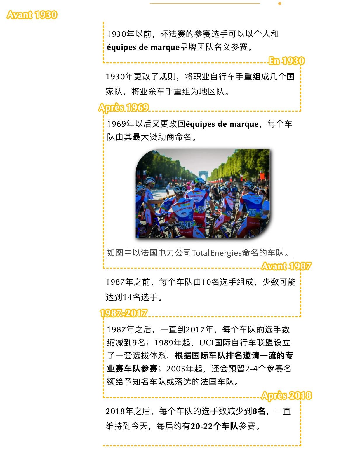 很早之前,团队排名第一的车队的所有选手会戴上黄色帽子,后来因为戴头盔成为了硬性要求,这种用来标识排名第一车队的黄色帽子就取消了;2006年开始,排名第一的车队统一佩戴黄色号码布,该队的领骑者还可以戴上黄色头盔。