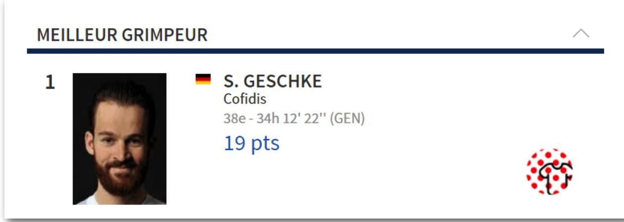 最终爬坡积分最高的选手在classement de la montagne pour les grimpeurs中排名第一并获得“爬坡王”的称号,身着maillot blanc à pois rouges波尔卡点运动衣。
