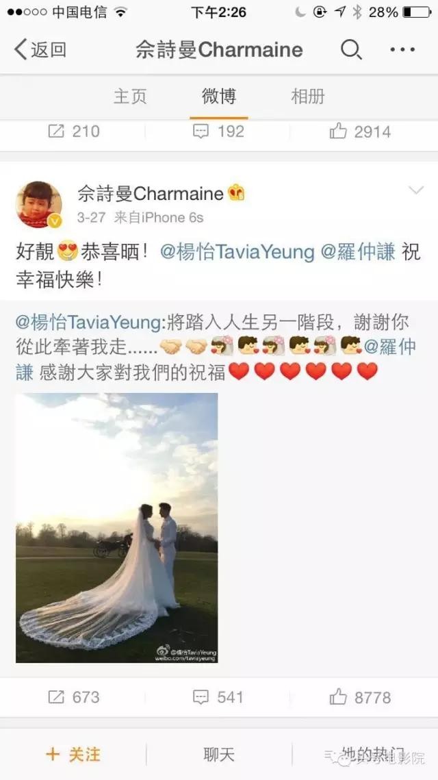 好姐妹杨怡刚刚和罗仲谦结婚了。佘诗曼还第一时间送上了祝福。