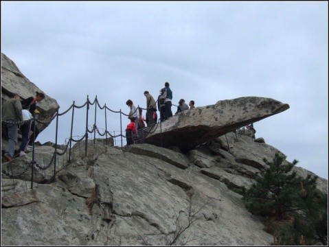 险八脚 指石龟颈部到头顶的一段路程。从天梭石至石龟顶部,其间岩石上翘。形如屋脊,宽不过尺,两侧崖壁如削,深达百丈。人们欲登龟头,必经此处,如有不慎失足,绝无生还的可能,故称险八脚。现已装防护铁链,可保安全,但恐高者还是胆战心惊。