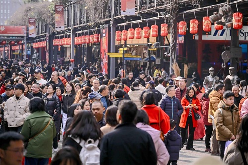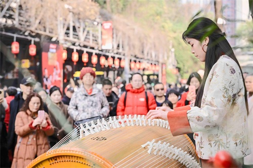 初一到初七, 园区东舞台音乐不断。春节期间,圆周率室内乐团为观众表演了《小步舞曲》等巴赫的经典作品,以及一些大家耳熟能详的流行歌曲。据了解,圆周率室内乐团是由四川籍青年羽管键琴演奏家姜维桦、刘昱飞等人发起组建的,是西南地区首支专注于演奏巴洛克时期室内乐作品的乐团。“现场氛围特别好,大家都很沉醉在音乐中,还会随着音乐摇一起唱起来。”乐团主理人崔珣告诉记者,“在过年的时候为大家带来表演我们特别开心,希望能用美妙的音乐向世界各地的游客表达我们美好的祝愿。”